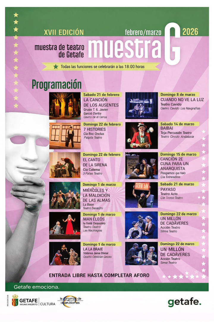 La XVII Muestra de Teatro de Getafe (MuestraG 2026) es un certamen escénico que se celebra entre finales de febrero y marzo en distintos centros culturales de Getafe, con una programación de obras teatrales a cargo de compañías nacionales y locales. Las funciones cuentan con entrada gratuita y acceso libre.